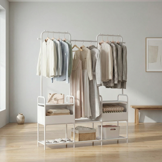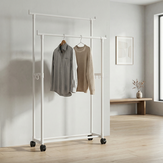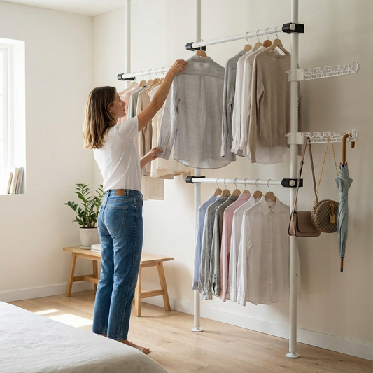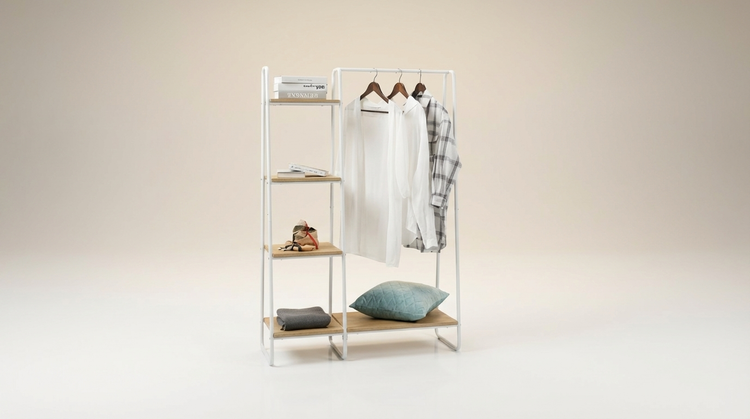 Ce type de portant est particulièrement adapté aux chambres, studios et dressing ouverts où l’esthétique et la clarté visuelle sont prioritaires.