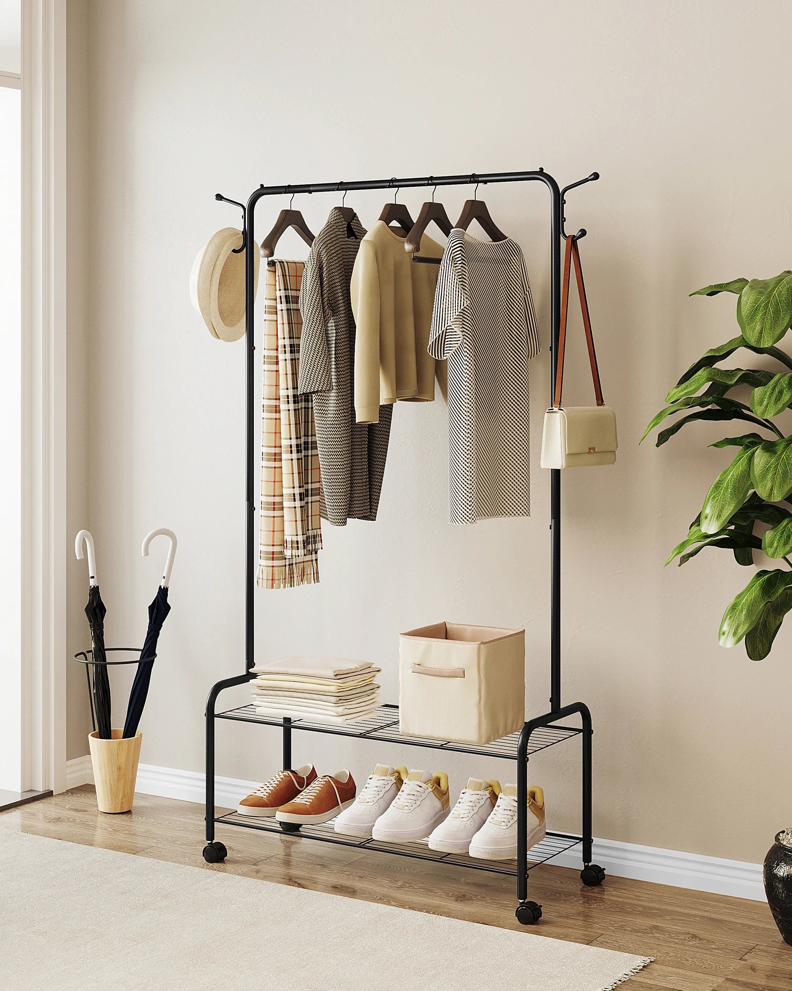 Portant vetement 3-en-1 avec étagères, roulettes et crochets pour un rangement optimisé