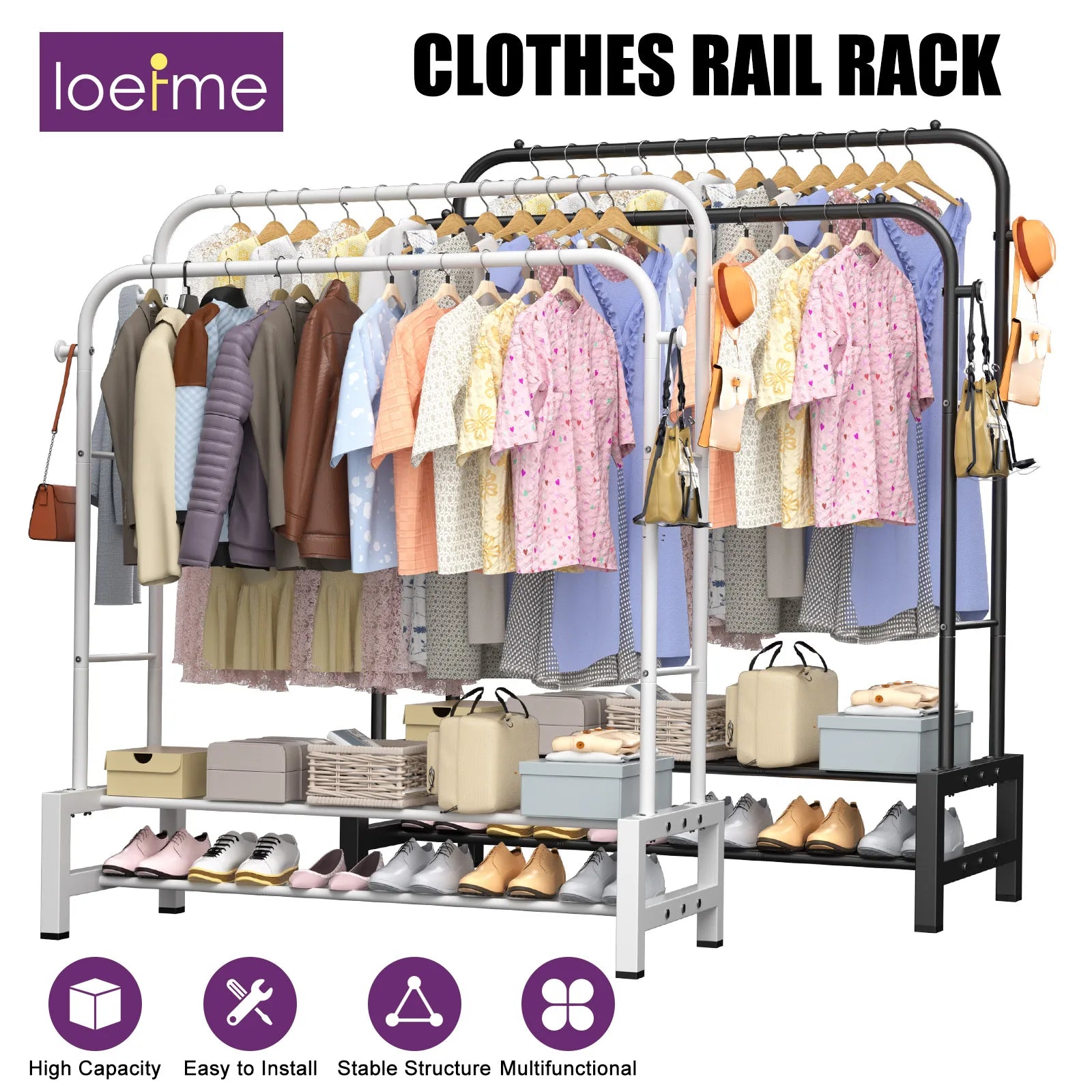 Ce portant vetement combine une structure en acier robuste avec une capacité de charge mesurée à 50 kg, grâce à ses tubes en acier de 2,2 cm de diamètre et 1 mm d’épaisseur. Sa conception à double-rail permet de suspendre les vetement longs sur la barre supérieure, évitant ainsi les plis, tandis que la barre inférieure accueille pantalons, pulls ou sacs pour un accès rapide au quotidien. Quatre crochets supplémentaires offrent un espace dédié pour chapeaux, écharpes ou ceintures, limitant le désordre.