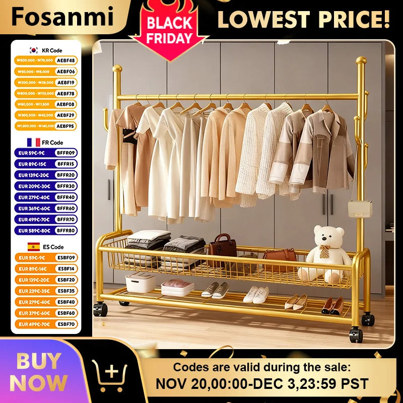 Porte manteau portant vêtement doré avec roulettes : solution mobile et double niveau pour organiser vos vetement