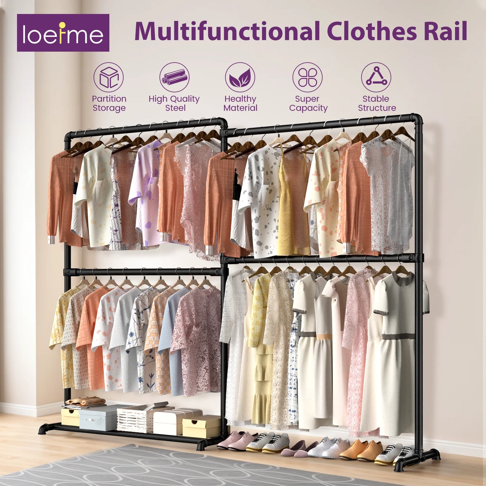 Ce portant se place idéalement dans un coin de pièce ou une entrée, où il maximise l’espace vertical et horizontal. Il permet de sécher ou ranger plusieurs types de vetement simultanément, tout en conservant un intérieur ordonné grâce à son espace de stockage intégré. Son design sobre en métal noir s’intègre facilement dans différents styles d’intérieur, du plus épuré au plus industriel.